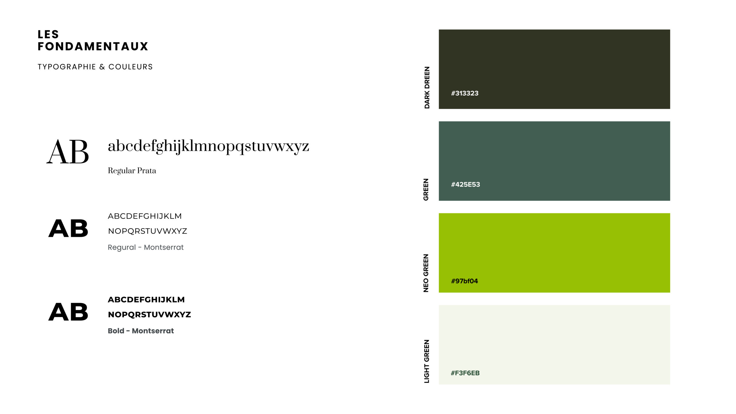 Élaboration d’une palette de teintes naturelles mais singulières, associée à des typographies sobres et contemporaines pour affirmer la personnalité de la marque.
