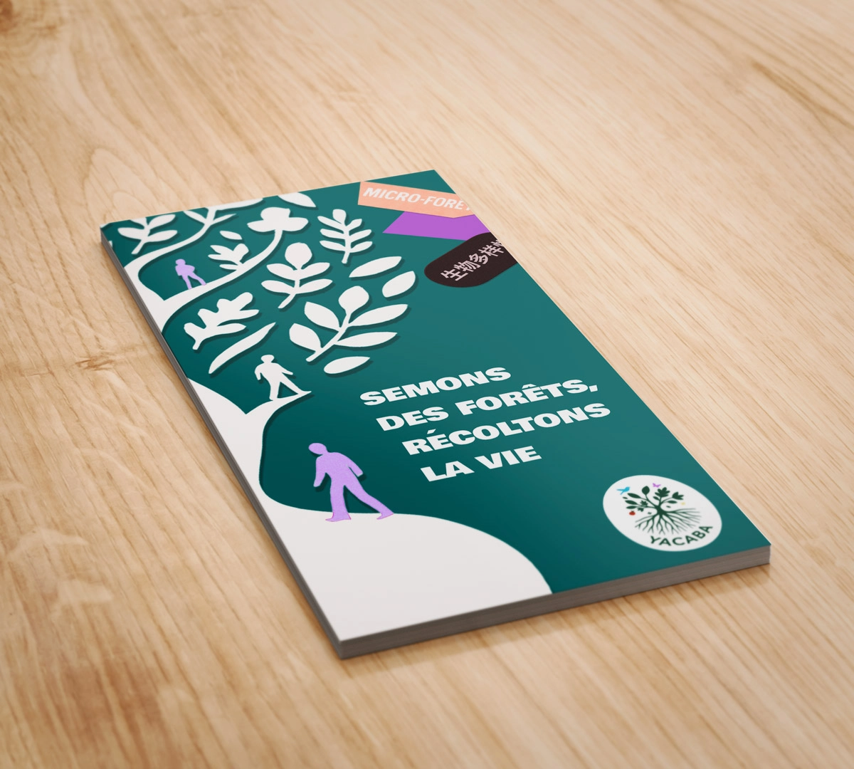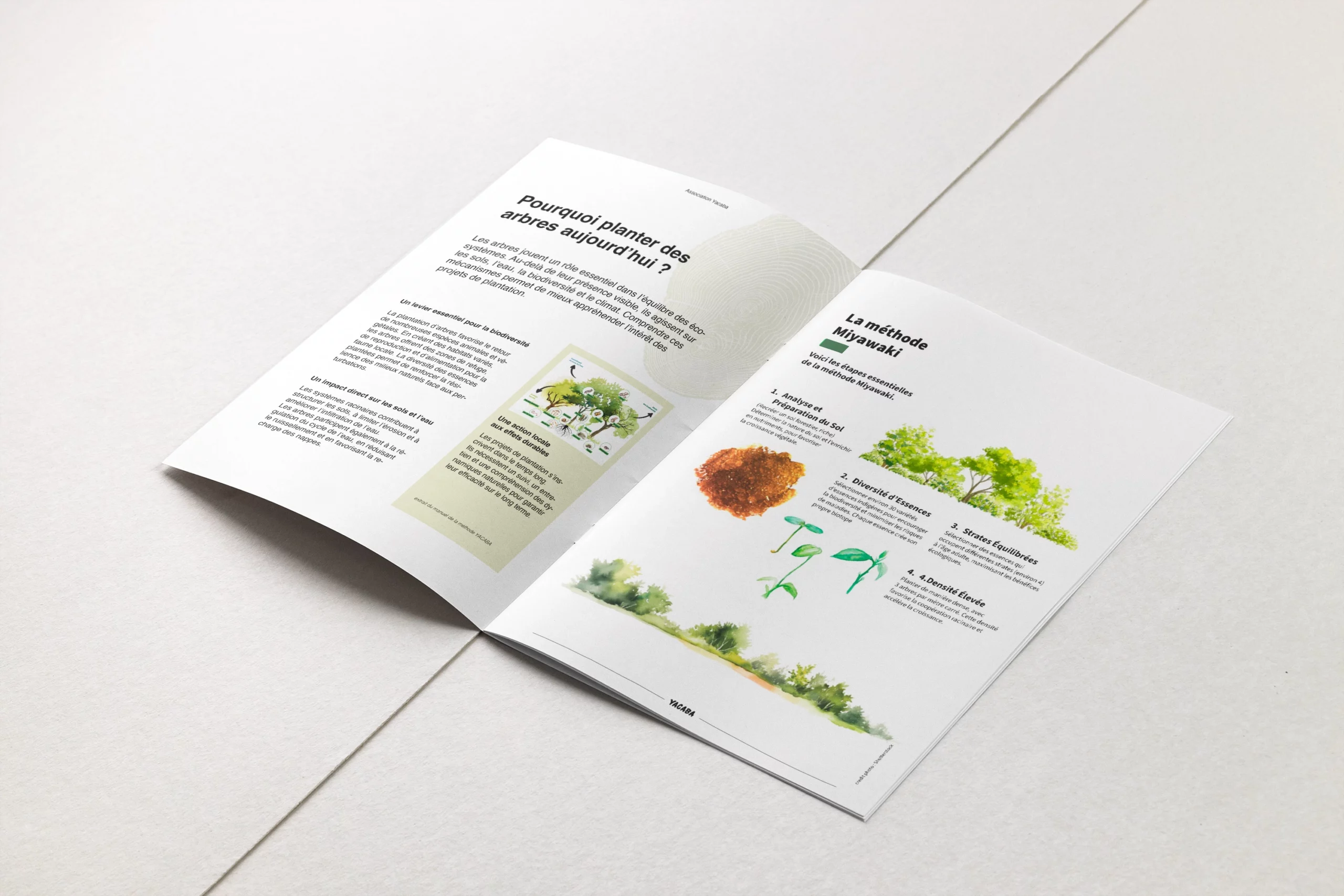 Déclinaison de l’univers graphique sur des supports pédagogiques et de communication, destinés à expliquer la méthode de plantation et à rendre les enjeux de la biodiversité accessibles au plus grand nombre.