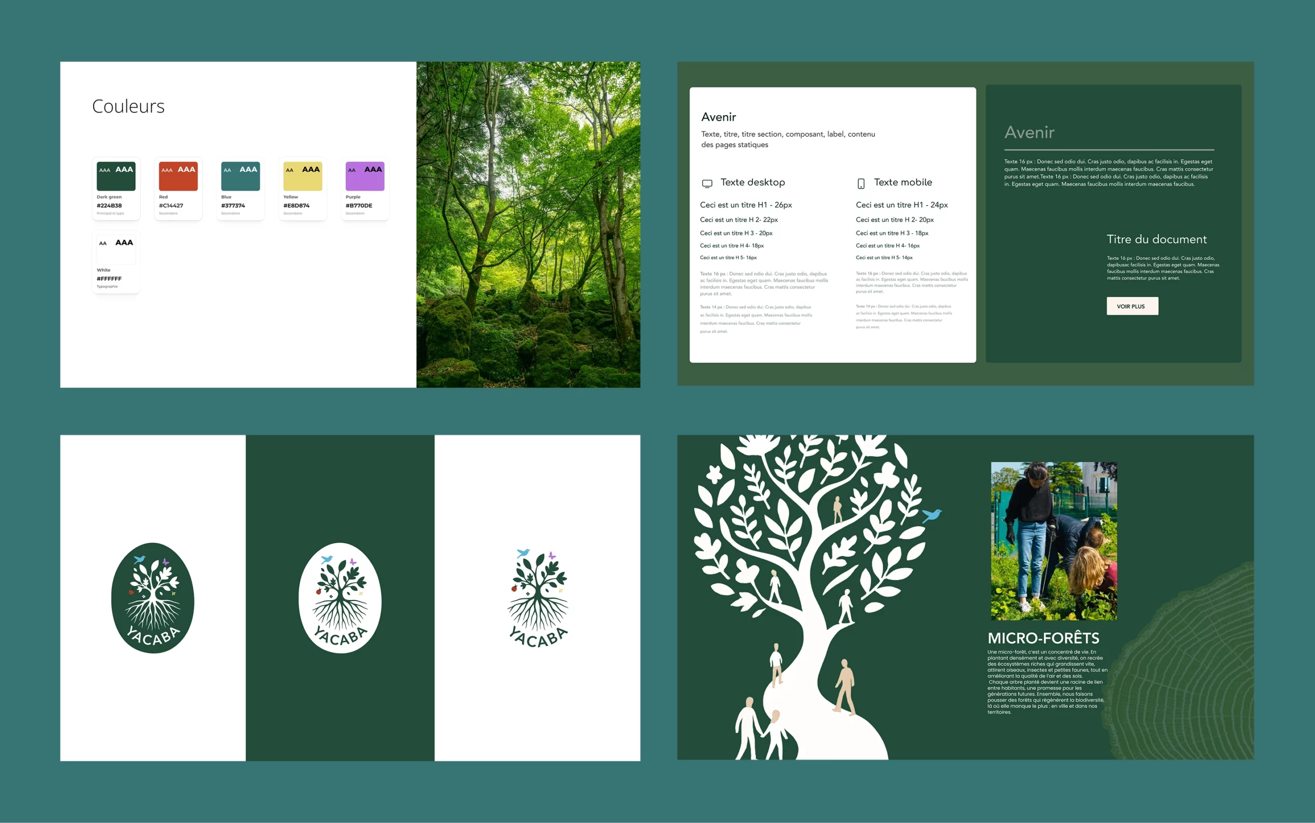 Construction d’un univers graphique sobre et engagé, basé sur une palette de teintes naturelles et une typographie lisible et contemporaine. Une charte pensée pour traduire visuellement les valeurs de YACABA : action collective, régénération du vivant et ancrage territorial.