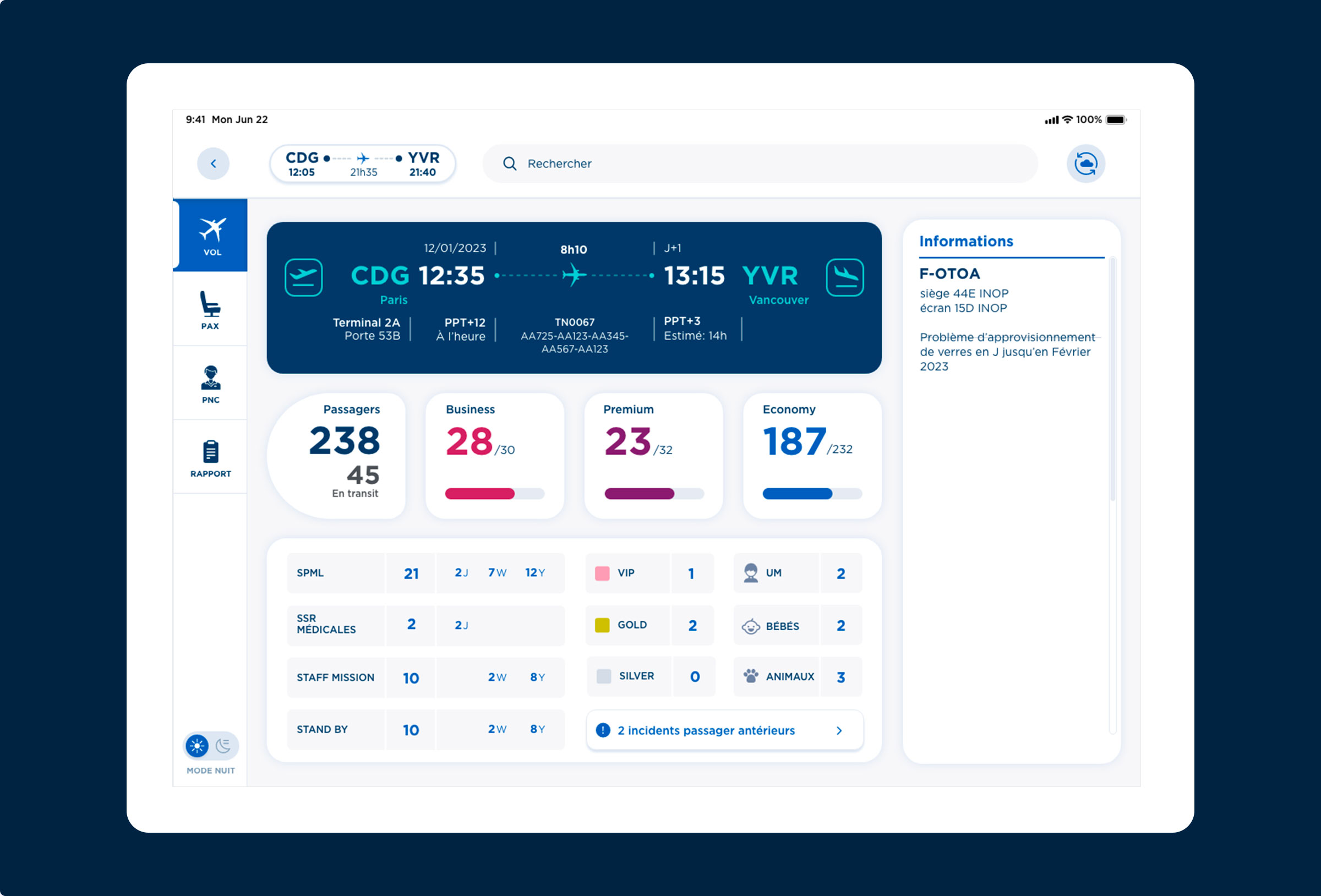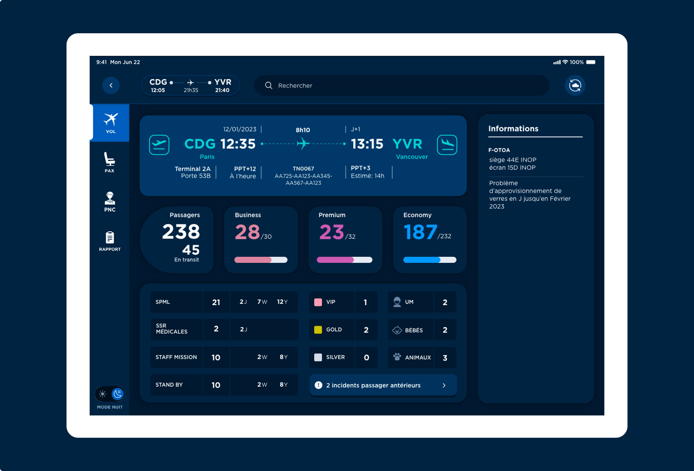Un outil qui soutient l’efficacité opérationnelle sans complexifier les gestes. Une application tablette fonctionnelle, claire et fiable, adaptée aux usages du personnel de bord. Une expérience utilisateur pensée pour le terrain, et non pour la démonstration